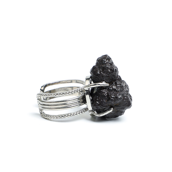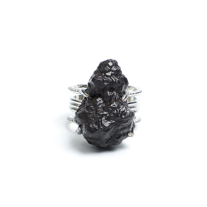 Crafted with a fragment of Black Impactite from the Egyptian desert, this ring carries the cosmic narrative of our solar system's formation. The meteorite's distinctive Widmanstätten patterns—natural crystalline structures formed through millions of years of slow cooling in space—create a unique metallic tapestry that speaks of interstellar journeys. Each dark grey stripe and geometric formation represents the crystallization process that occurred in the vacuum of space, rendering every pattern utterly unique and impossible to replicate.