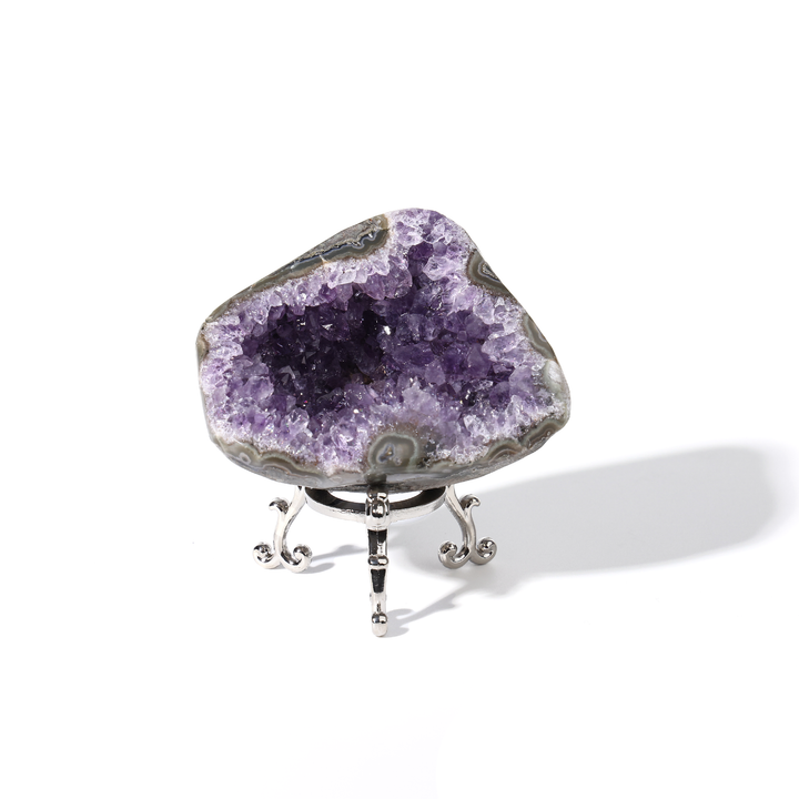 This naturally formed amethyst geode from Brazil presents a sculptural hollow of deep violet crystals, creating a vessel-like formation with multiple crystalline layers. The specimen's concave structure features generations of quartz crystals that create a luminous interior surface, while the natural cavity forms a protective enclosure. The piece serves as a striking decorative element for personal spaces, where its rich purple hues and organic form create visual interest.