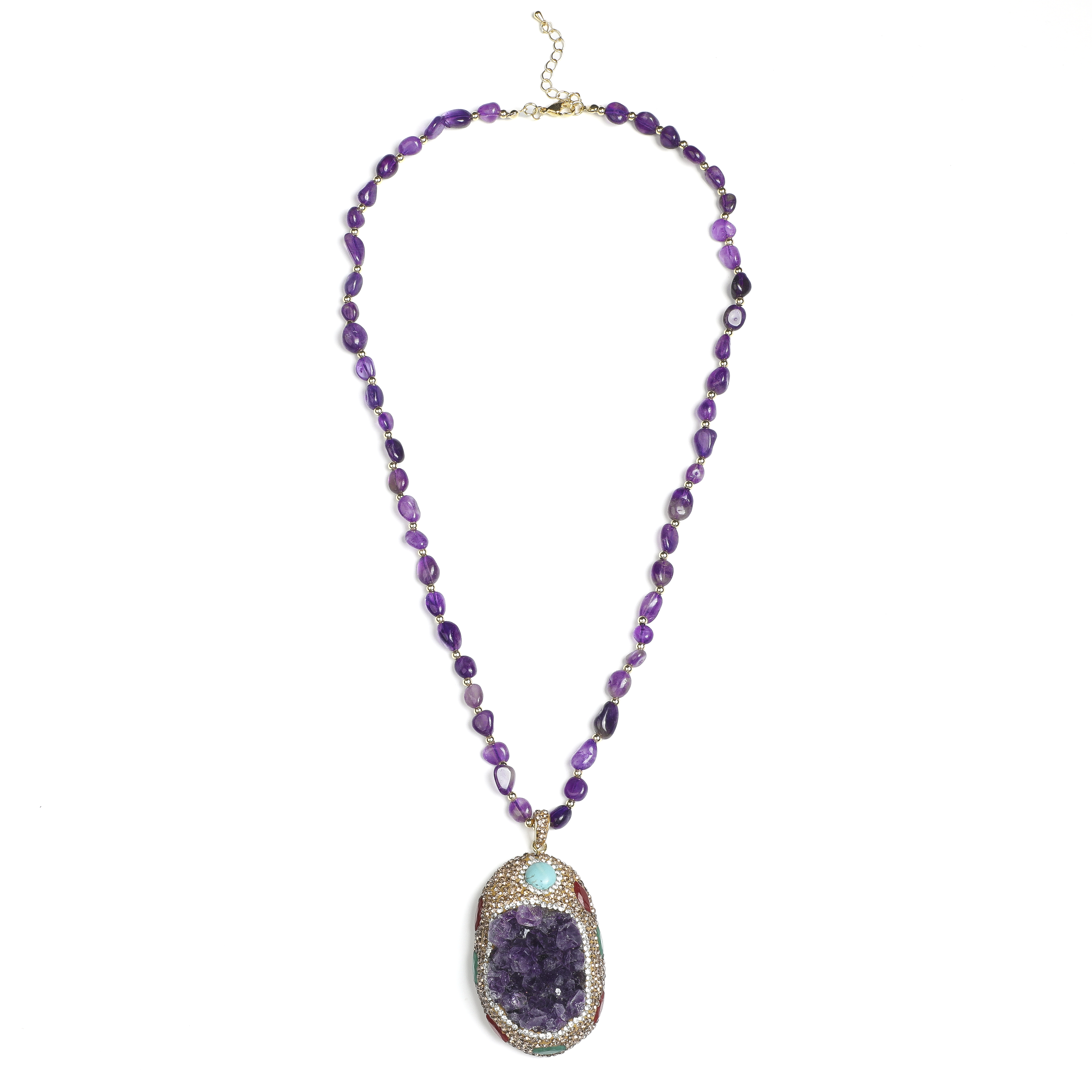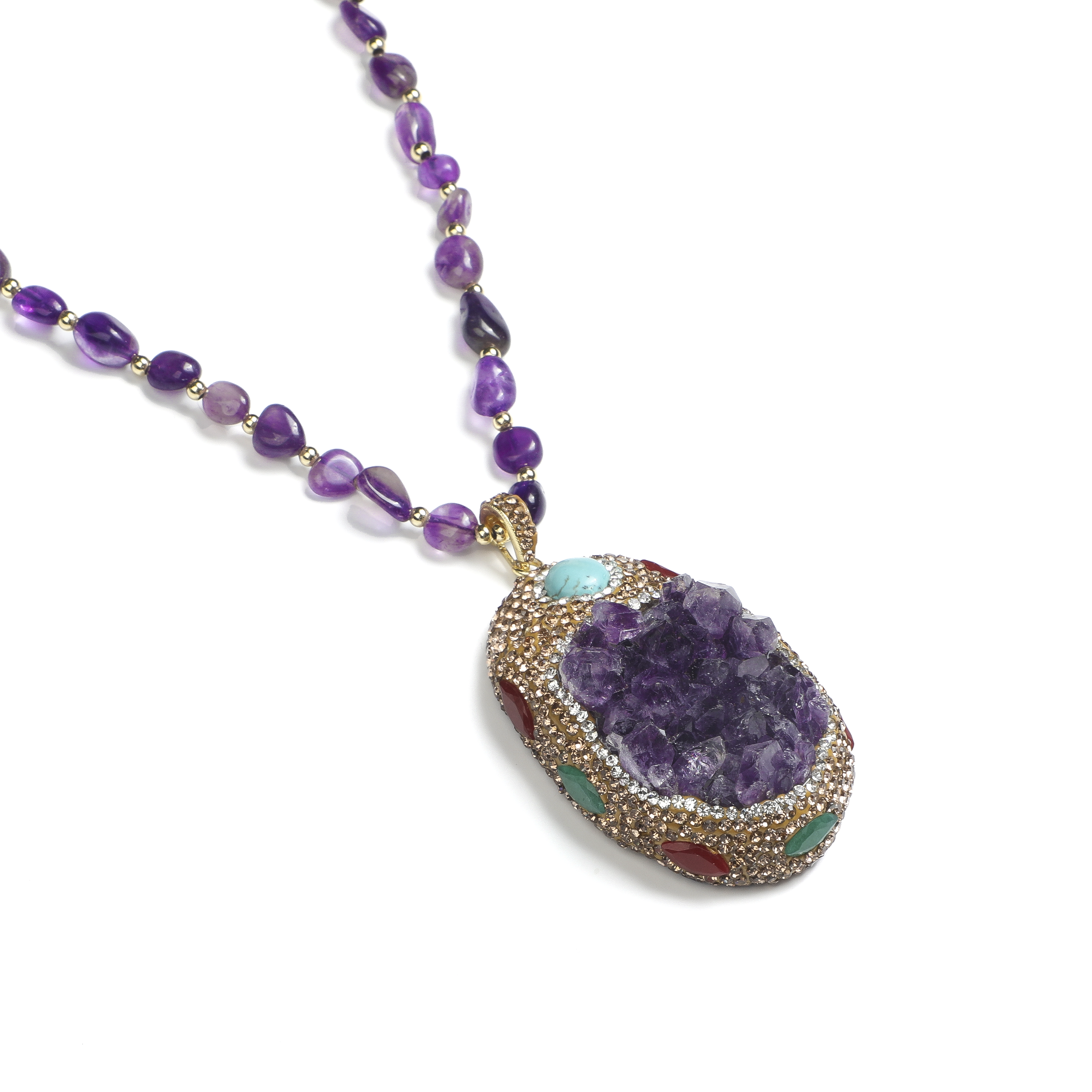 An Asian artist's enchanted garden vision comes to life through seasoned craftspeople's intricate work, showcasing ARTLUMINNA's dedication to creating emotional connections through natural wonders. This necklace presents a natural Brazilian amethyst cluster where Indian red and green agate stones nestle among crystals via hand-twisted titanium wire techniques. Master artisans preserve the cluster's natural structure while creating botanical illusions, reflecting the brand's commitment to authentic curation and spiritual awakening. This piece aims to awaken profound connections to nature's magic through its mineral narrative. Exclusive creation designated AL-MC-008.