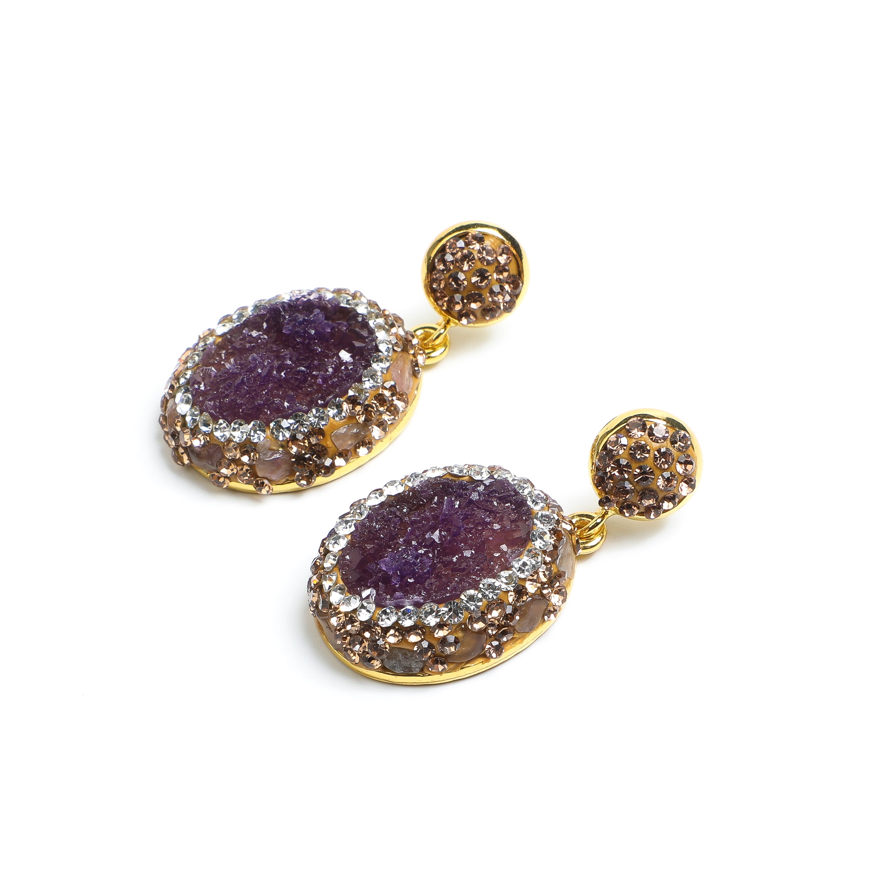 Luxurious harmony between organic form and refined design is skillfully captured through artisanal technique, reflecting ARTLUMINNA’s philosophy of uniting natural amethyst clusters with two-tone crystal brilliance. These enchanting earrings present amethyst clusters arranged in symmetrical composition, set upon a gold base interlaced with gold and cognac-toned crystals. The rich texture of each amethyst and the luminous faceting of the crystals are carefully hand-assembled to deliver a radiant visual experience, enhanced by a circular cognac crystal detail at the top for a refined finish. The deep tone of amethyst merges with the opulent glow of dual-tone crystals, creating an elegant balance between raw beauty and artful execution. Expert craftsmanship ensures both structural elegance and wearing comfort, making these earrings a natural choice for those who appreciate artistry and sophistication—a true expression of ARTLUMINNA’s fusion of mineral inspiration and luxurious design. Handcrafted work, a unique piece, No. AL-ER-022.