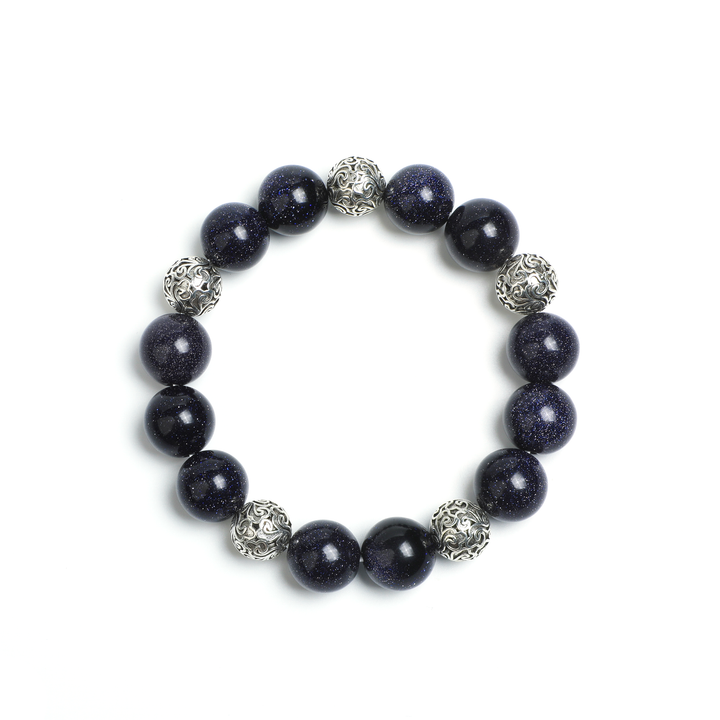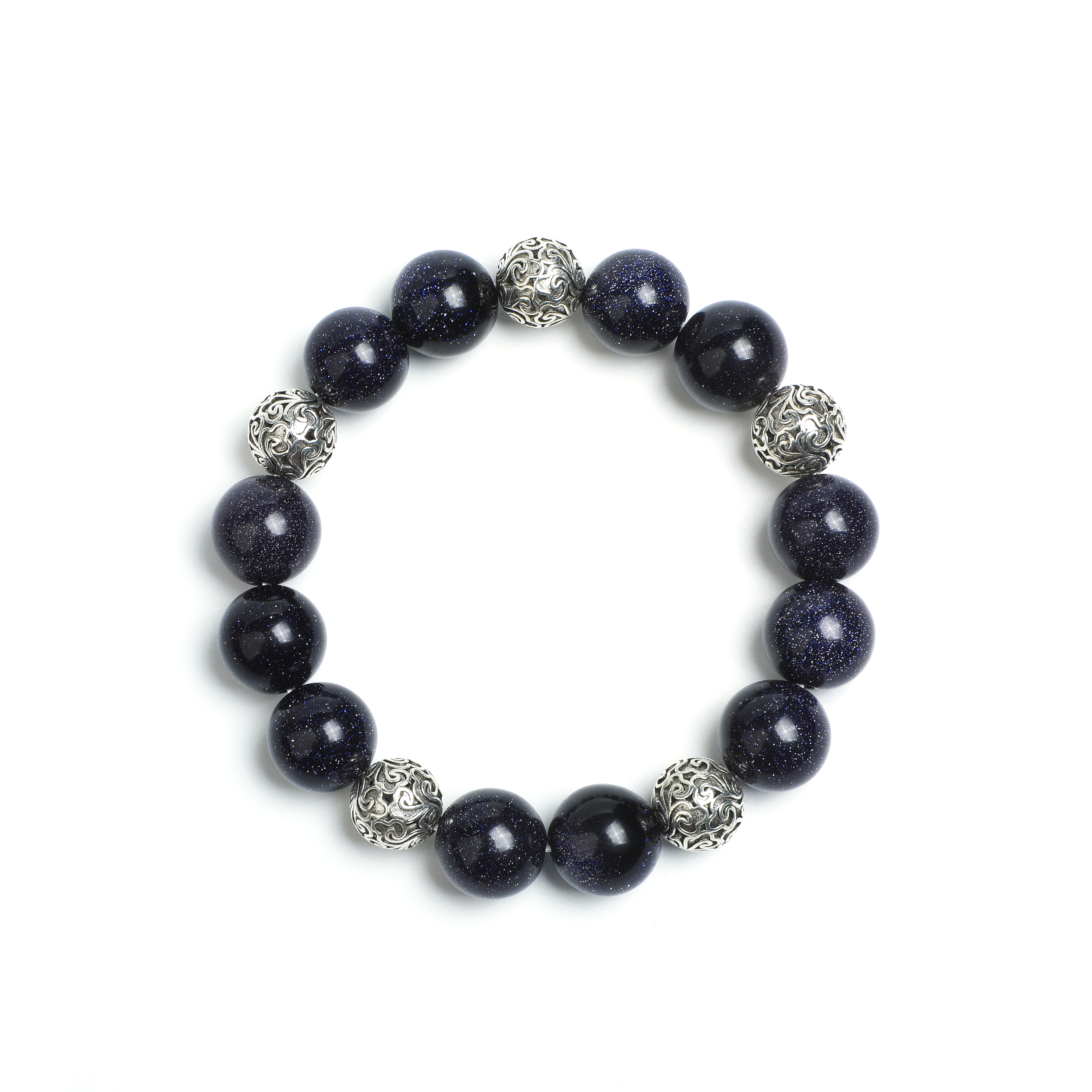 This bracelet features natural blue goldstone beads, each displaying a deep blue background resembling the night sky, with shimmering silver inclusions scattered like countless stars. As light shifts, the silver particles create a dynamic, flowing galaxy effect. The polished beads feel cool to the touch, exuding an aura of mystery.