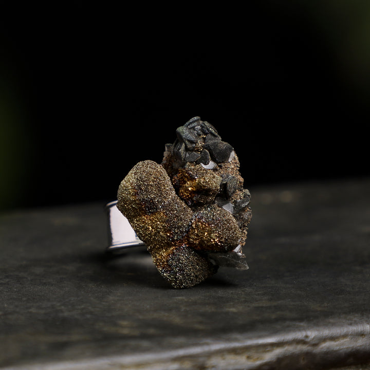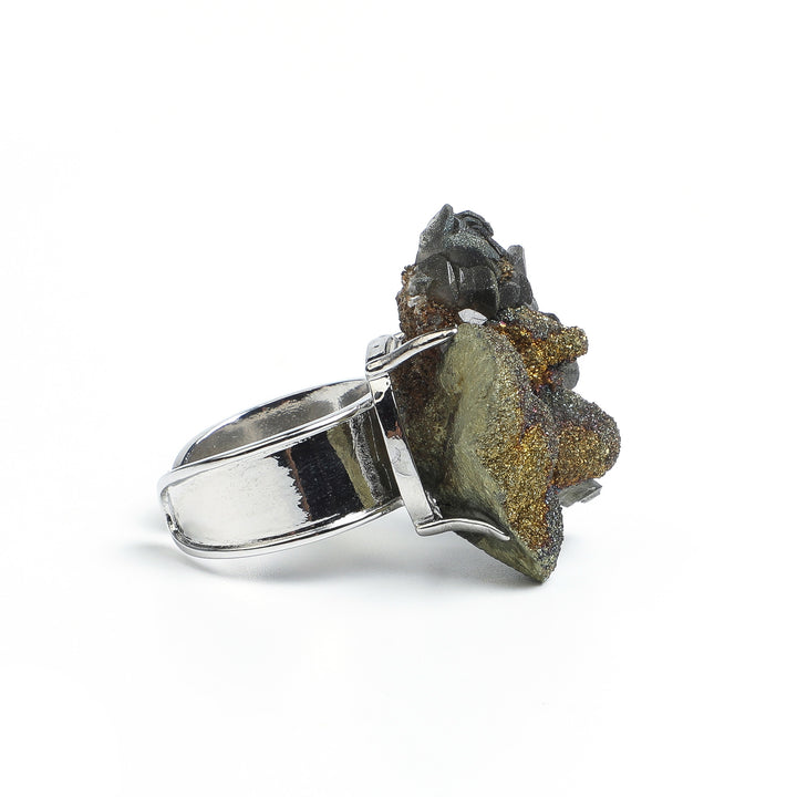 After extensive exploration and meticulous selection in Hubei Daye, a world-renowned mineral source, ARTLUMINNA uncovered this pyrite scale crystal embodying nature's geometric rhythm. Layered crystalline plates shimmer with golden warmth in flowing light, each carefully placed to preserve its unique character while achieving perfect harmony. As this golden light dances upon your finger, it whispers tales of stories gathered through time. Let this precious gift from the earth's depths accompany you through every meaningful chapter of life's journey.