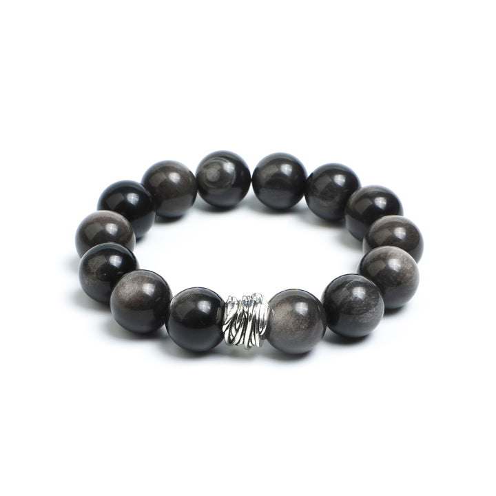 This men's bracelet features natural tiger eye and black obsidian beads, thoughtfully combined with antiqued silver spacers. The tiger eye stones exhibit a characteristic golden-brown banding effect that shifts in different lighting, while the black obsidian beads display a subtle natural sheen. The silver components feature a specially applied patina that gives them a distinguished, time-worn appearance.