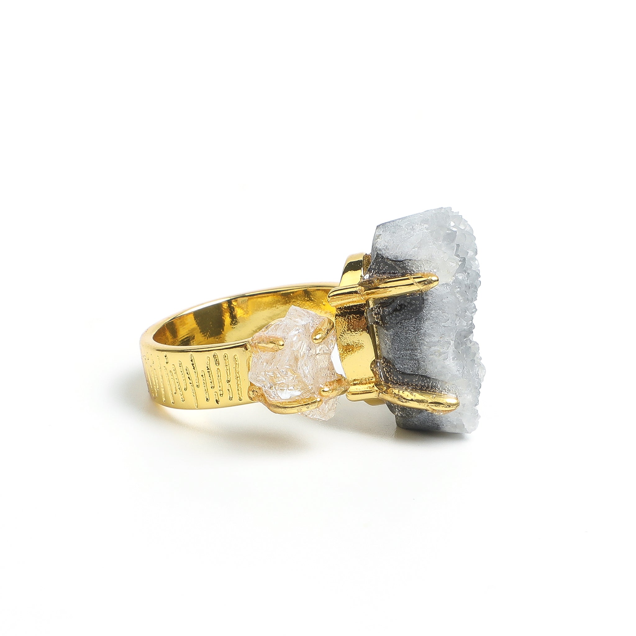 Guided by natural modernism philosophy, ARTLUMINNA selected natural gray calcite and citrine to create this ring. The gray calcite displays delicate stone-like veining, while the citrine accents resemble sunlight touching rock surfaces, showcasing a harmonious dialogue between earthy tones and warm radiance through hand setting techniques.