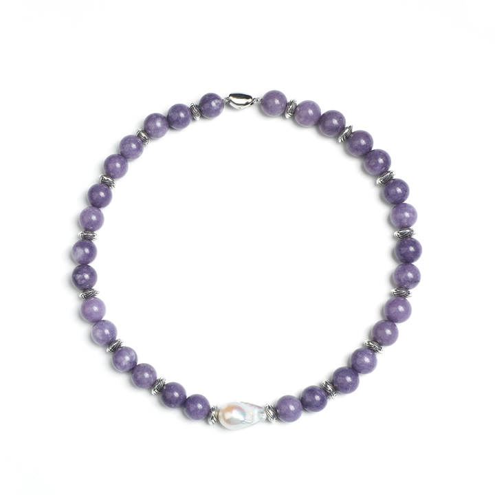 The necklace’s drop length is thoughtfully designed to transition effortlessly from daily wear to special occasions. Here, the soothing presence of amethyst and the organic warmth of pearls come together, lifting this piece beyond mere accessory into a wearable art object — one designed to resonate with calm and balance.