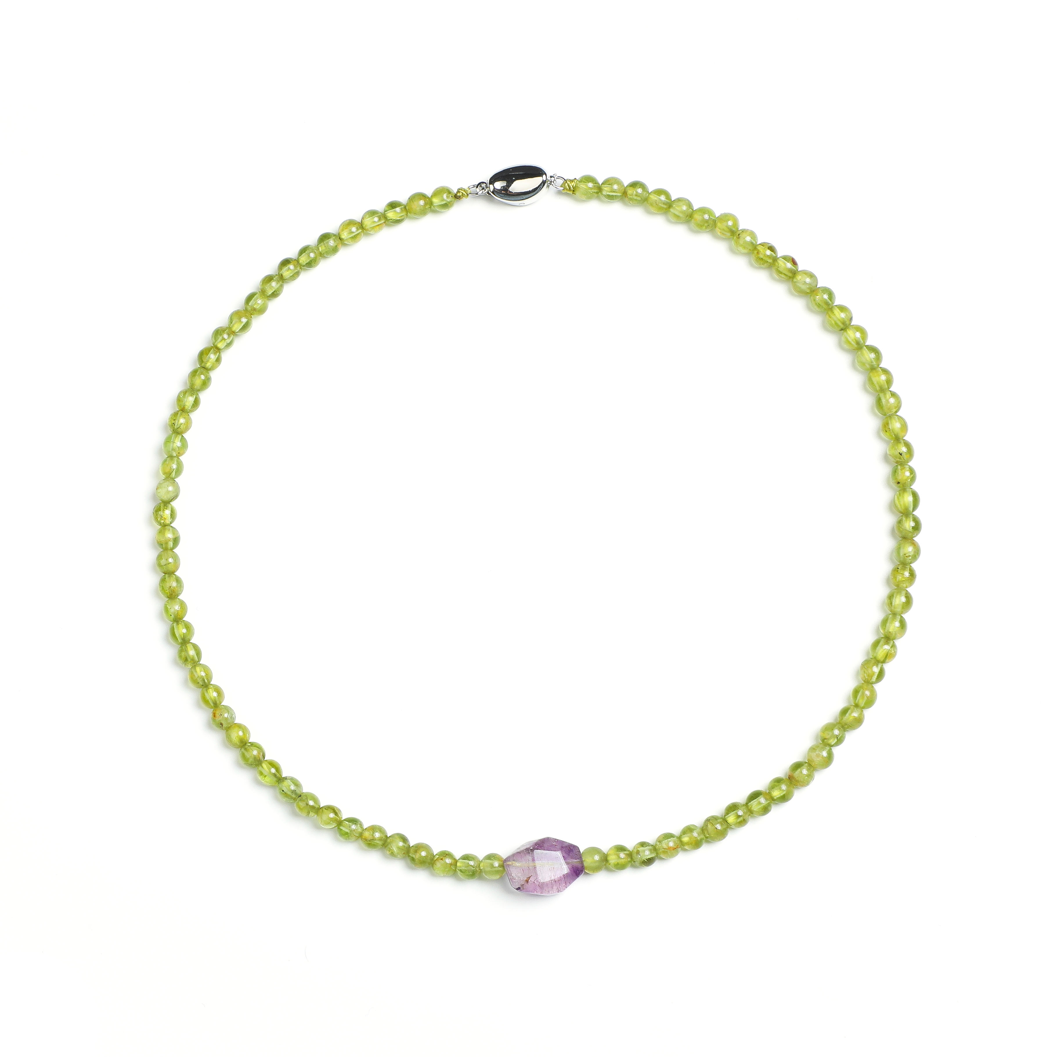 The design embodies ARTLUMINNA's philosophy of luminous transformation, where raw materials undergo thoughtful refinement to reveal their inherent beauty. Silver-toned elements connect the stones in a graduated arrangement that represents the wearer's personal journey of growth and discovery. Worn as a statement of natural elegance, this piece balances peridot's revitalizing properties with super seven's energetic harmony and amethyst's calming influence, creating a wearable expression of the brand's commitment to meaningful craftsmanship and earth-inspired design.