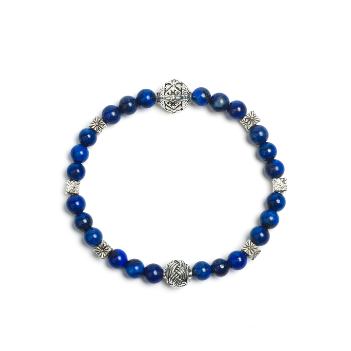 This refined bracelet showcases lapis lazuli from Afghanistan's historic mines, where its deep blue hue with golden pyrite inclusions evokes the night sky. The stone's natural patterns are enhanced through careful hand-polishing that preserves its organic character, while silver-toned accents provide subtle contrast. Drawing from Eastern aesthetics, the design embodies the philosophical balance between celestial inspiration and earthly beauty, creating a piece that feels both timeless and contemporary.