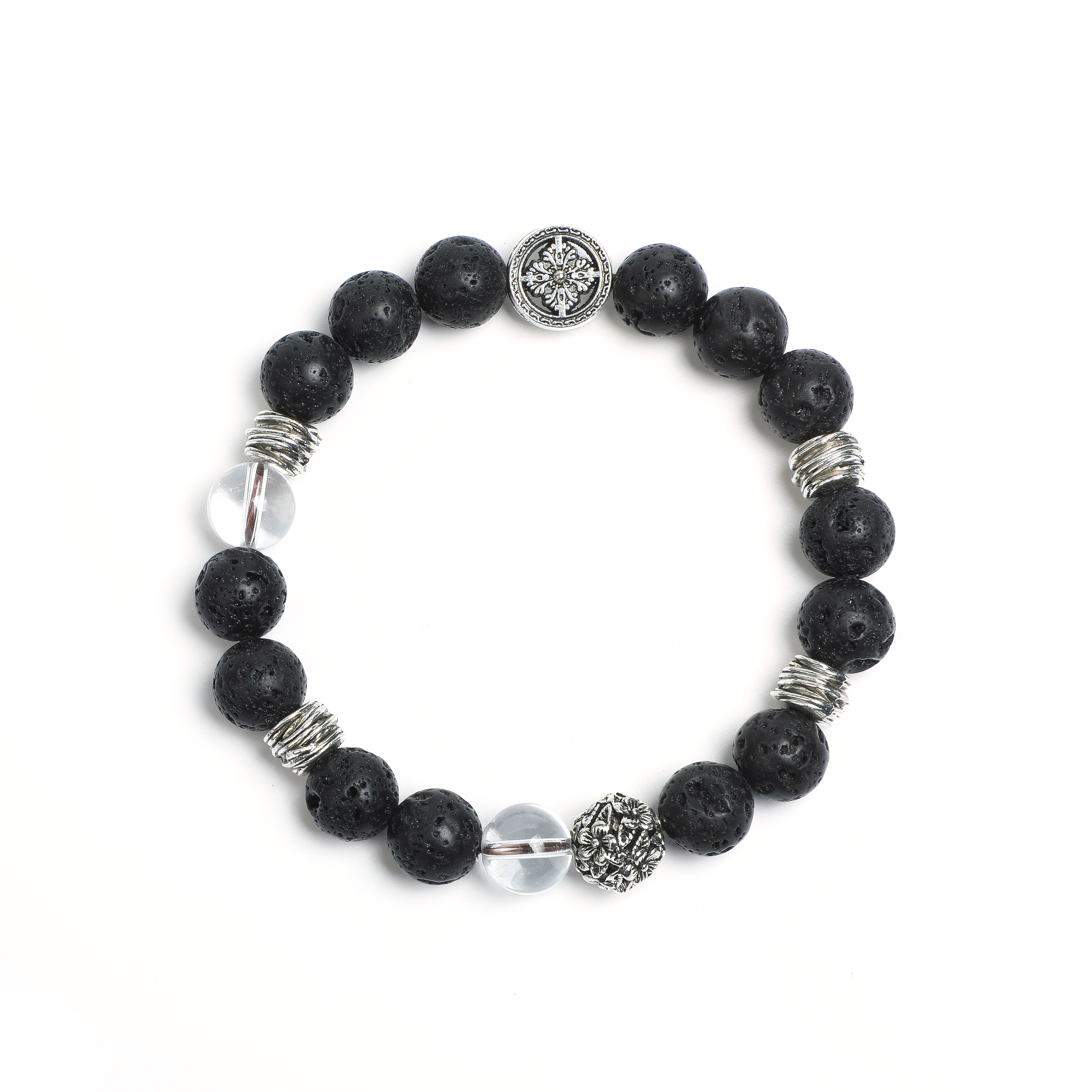 This men's bracelet combines natural white quartz and lava stone, creating a dialogue between purity and strength. The white quartz beads are translucent with natural cloud inclusions, while the lava stones are porous, dark-colored, and lightweight. The alternation of the two stones presents a striking contrast in texture and appearance.