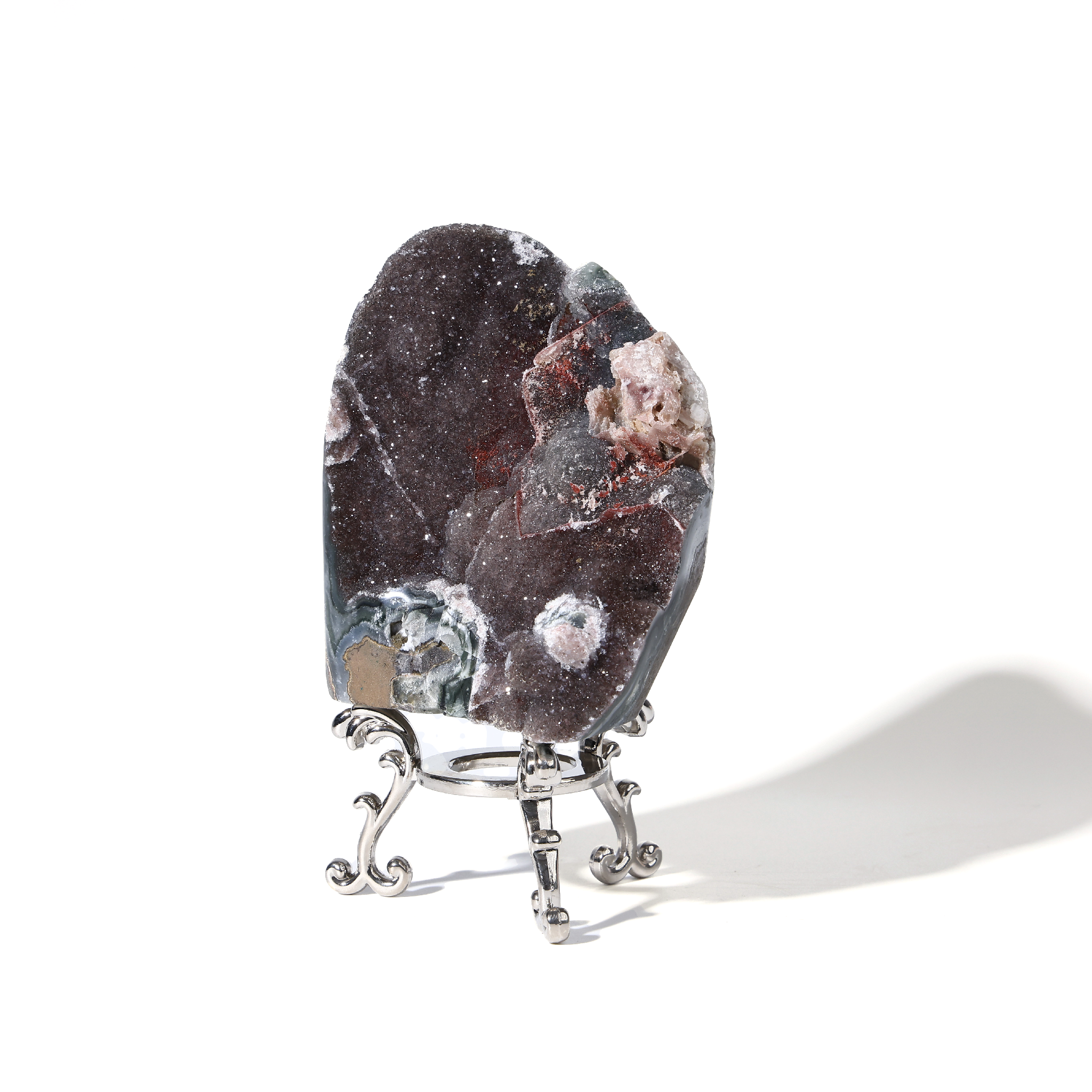 Selected personally by our founder from the remote mountain deposits, this rare specimen represents the convergence of multiple mineral solutions that crystallized in perfect artistic synchroncity. The rhodonite roses appear to float within the amethyst background, their deep red tones creating dramatic contrast against the soft purple foundation. In crystal traditions, such colorful mineral symphonies are believed to support creative inspiration and emotional richness, their harmonious combination thought to awaken artistic sensibility and appreciation for life's beauty.