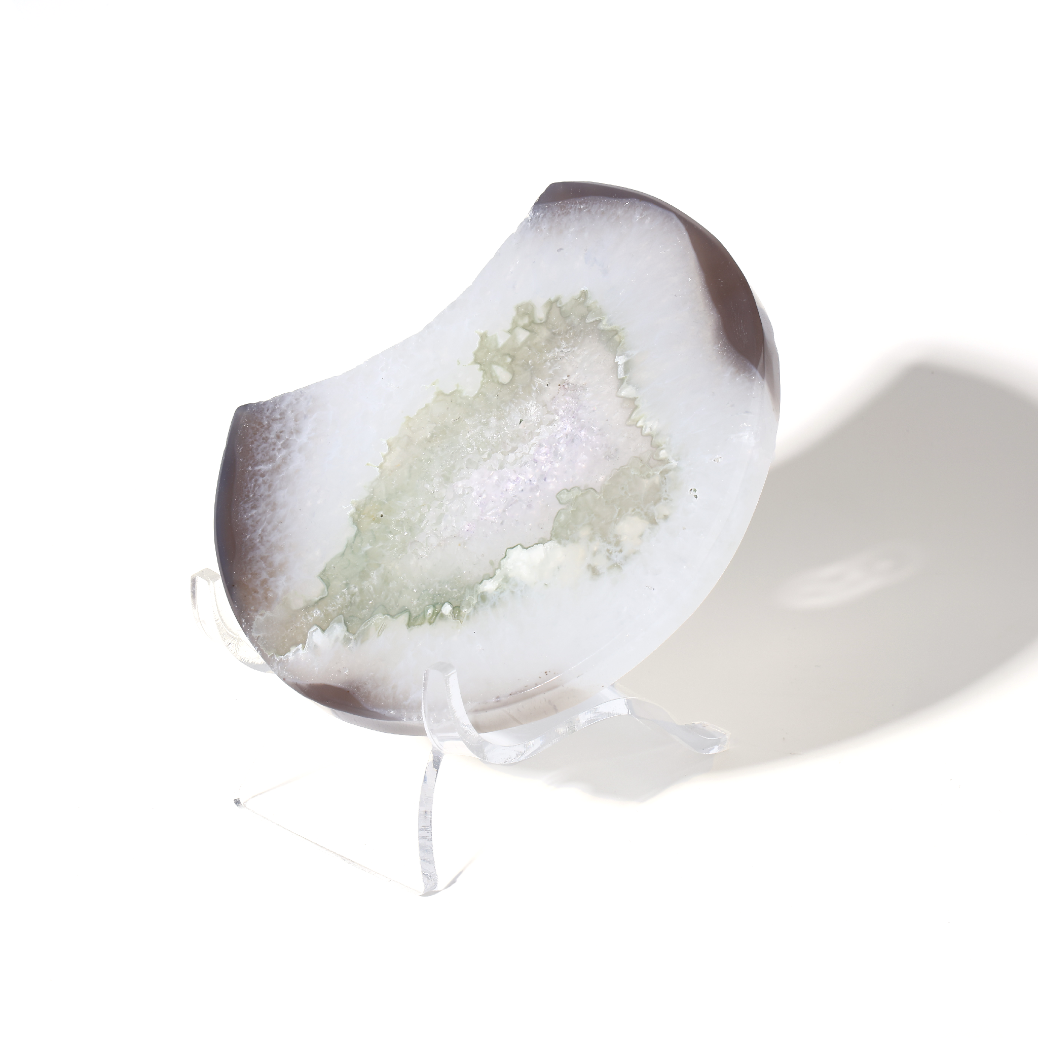 The specimen's color palette transitions from silvery-white outer edges to deep emerald depths, creating a visual representation of lunar reflection on forest waters. Tiny crystal formations within the geode appear like submerged treasures, their intricate patterns revealing the patient artistry of mineral deposition over centuries. This piece represents ARTLUMINNA's commitment to curating only the most spiritually resonant natural artworks, selected personally by our founder during alpine expeditions for their ability to evoke profound connections to nature's most poetic moments.