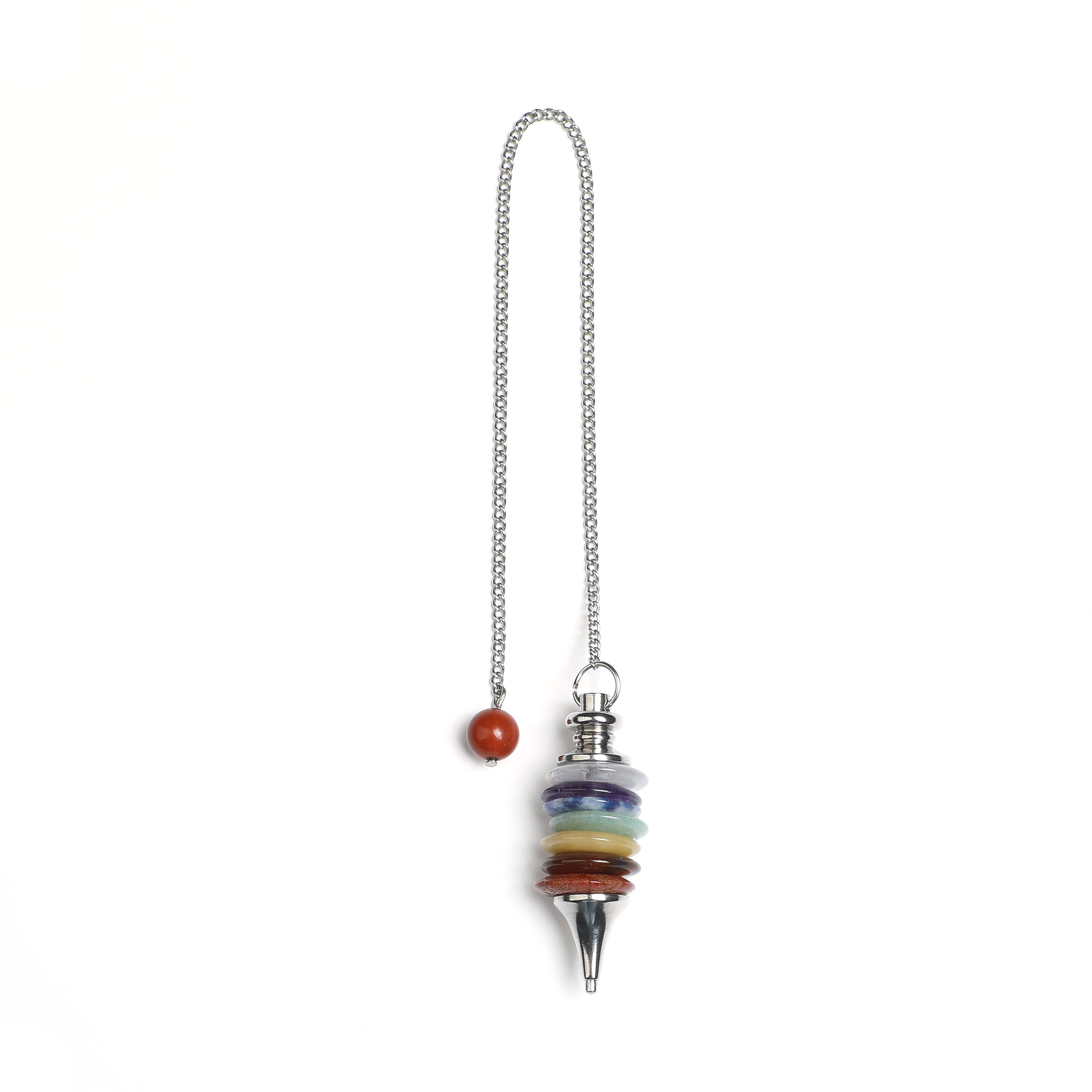 This natural crystal pendulum features seven distinctive minerals, including clear quartz, amethyst, snowflake obsidian, aventurine, citrine, carnelian and red jasper, forming a complete energy pendulum set. Each crystal measures 18mm in diameter with a total weight of 24 grams, displaying earth's natural color spectrum - a truly collectible mineral pendulum.