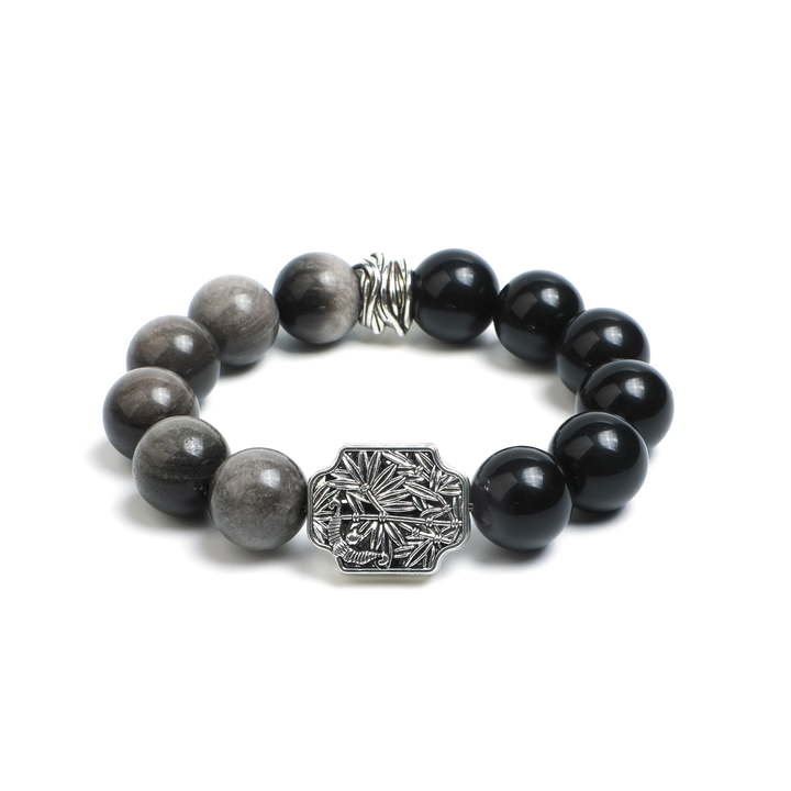 This bracelet combines natural black obsidian and silver sheen obsidian beads with bamboo-inspired spacers. The black obsidian displays deep glossy black, while silver sheen obsidian shows unique metallic iridescence. Bamboo spacers feature engraved natural textures in metal, creating harmonious contrast with the two-toned obsidian.