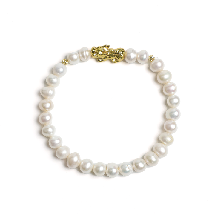 This pearl and gold pi xiu ornament combines soft elegance with opulent splendor. Its design embodies refined cultural heritage, featuring a grand style with profound symbolism. Perfect for those who cherish traditional elements, it showcases unique taste and grace.