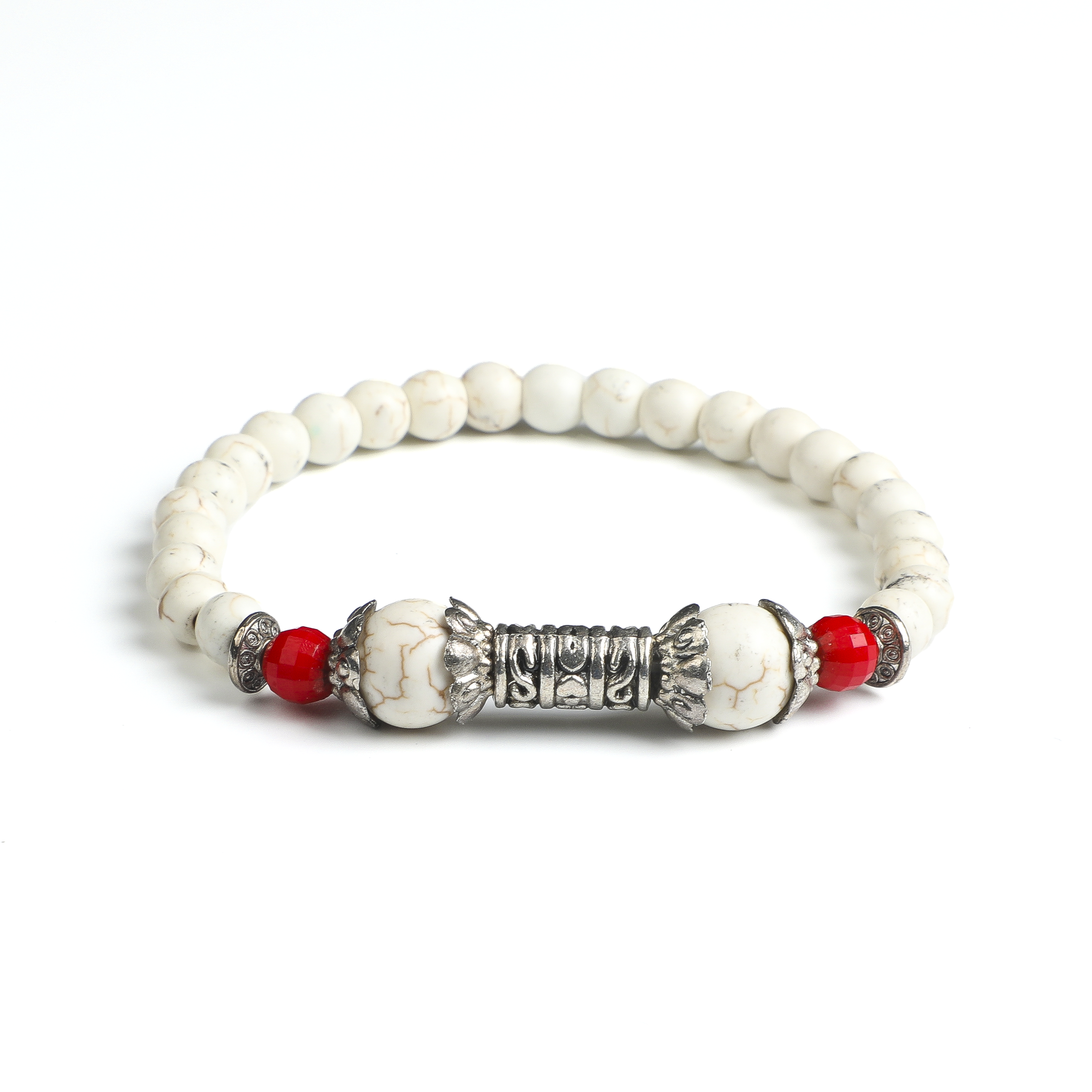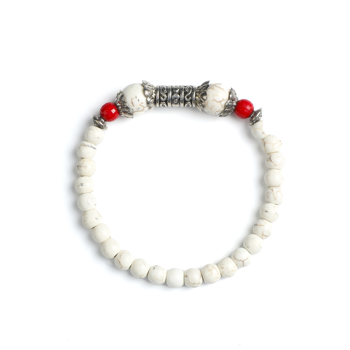 This antique-inspired silver jewelry features creamy white pearl strands accented with vibrant red. A central vintage-style carved metal bead adds a ceremonial touch, symbolizing protection and faith. The palette is subdued yet powerful.