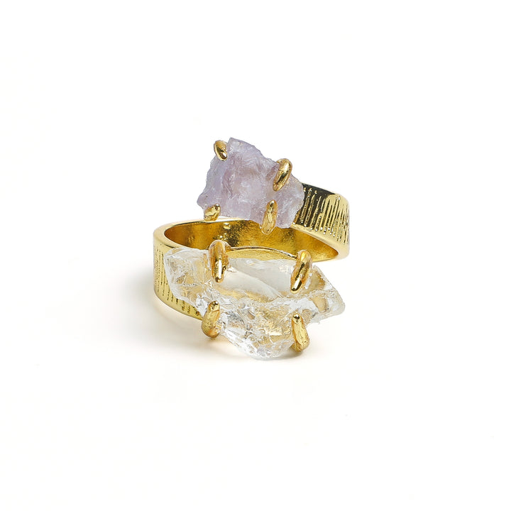 The double-end design gracefully transitions between daily styles: the clear quartz side accents professional attire, while the amethyst side enhances life's special moments. The slender ring fits various finger shapes, accompanying you seamlessly from coffee breaks between meetings to leisurely weekend strolls.