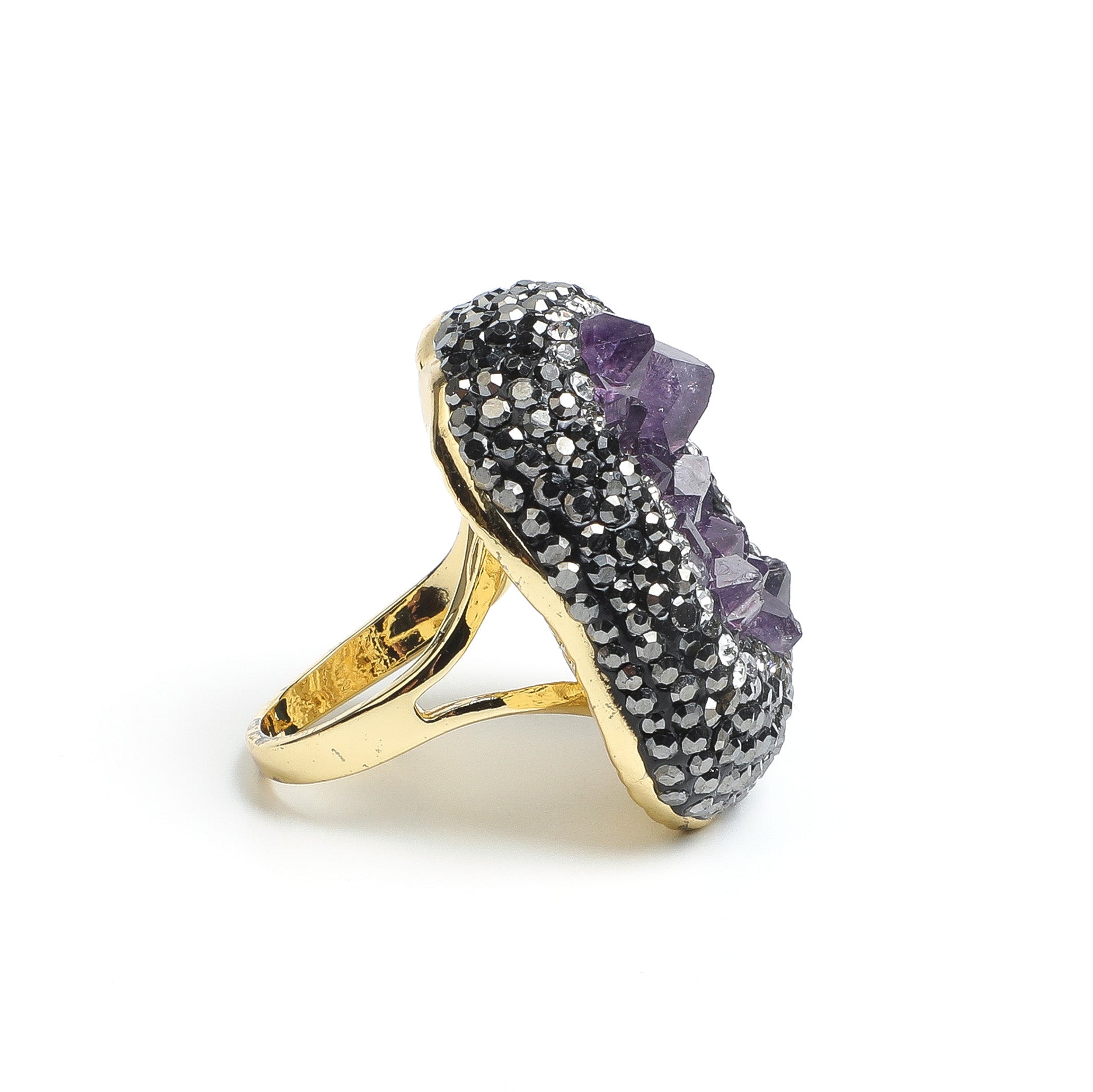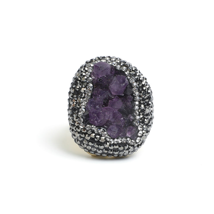 An Asian artist's exploration of shadowed elegance finds sophisticated expression through master artisans' tonal craftsmanship, embodying ARTLUMINNA's philosophy of uniting mysterious beauty with refined contrast. This compelling ring features a deep Uruguayan amethyst precisely cut to showcase its rich purple depths, set against a graduated arrangement of smoke-grey crystals that create a subtle ombre effect. The amethyst's multifaceted surfaces interact with the smoky accents to produce a sophisticated play of light and shadow, where each facet captures and softens the surrounding illumination. Senior artisans employed specialized setting techniques to ensure seamless color transitions between the violet center and the grey crystalline frame. The amethyst is traditionally considered to enhance intuitive wisdom, while the smoke-grey crystals are believed to carry grounding energy and subtle protection. Worn as a statement of mysterious sophistication, this ring adds a touch of shadowed elegance to both daytime refinement and evening allure, appealing to those who find beauty in life's nuanced transitions. The exclusive creation carries identification AL-RG-016.