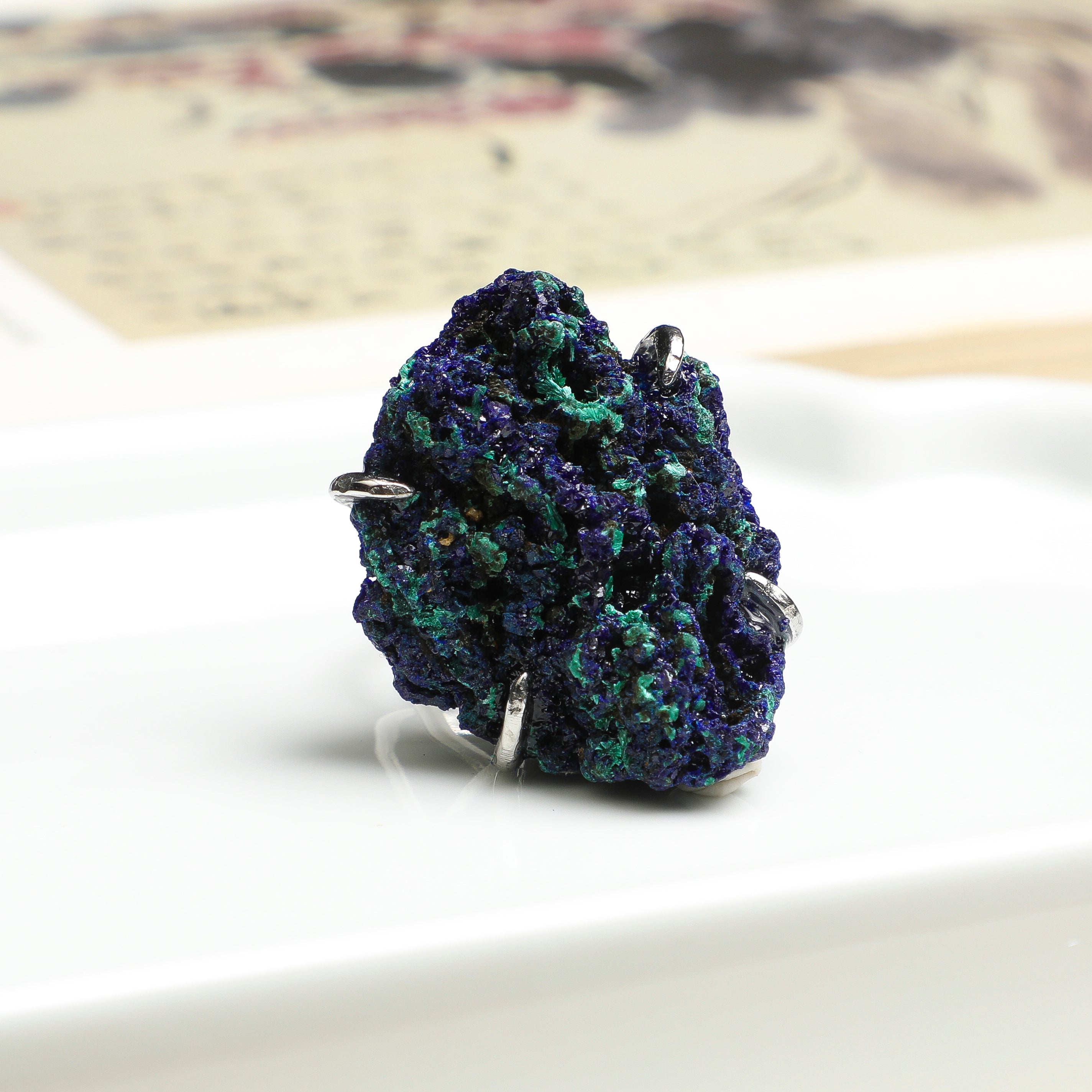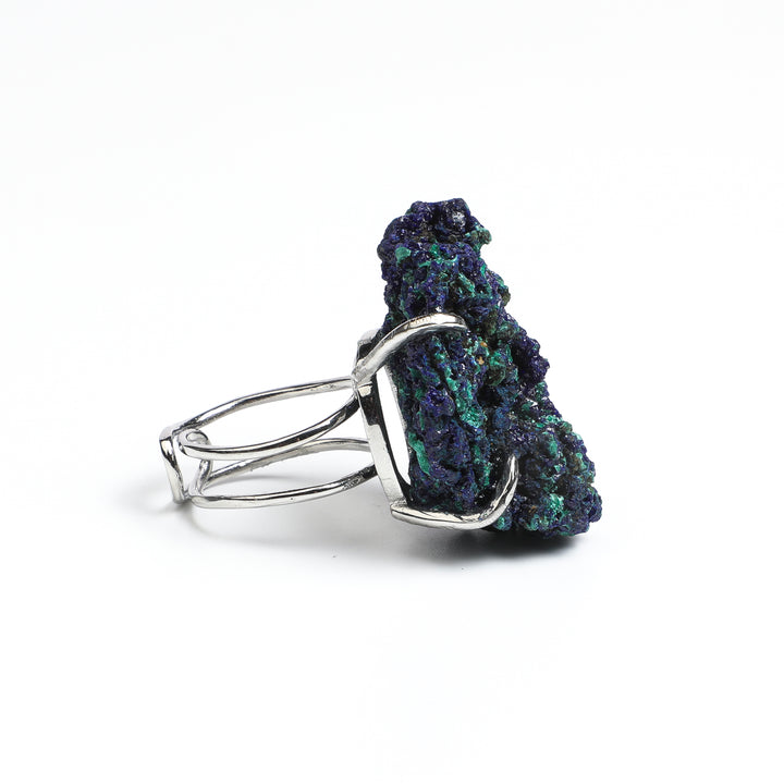 This distinctive piece features an Azurite specimen sourced from Morocco's ancient mining regions, presented in its natural form with a vibrant blue reminiscent of classic natural pigments. Each stone is carefully hand-set by artisans to preserve its unique crystalline structure, creating a wearable representation of geological artistry. The design reflects an appreciation for organic beauty and timeless elegance, making it suitable for both daily contemplation and as an elegant accent. The blue mineral has historical connections to creative inspiration and perspective. As part of ARTLUMINNA'sWorldly Wanderlust, this ring represents selective sourcing of global minerals, transformed through traditional craftsmanship into a personal object of natural beauty.