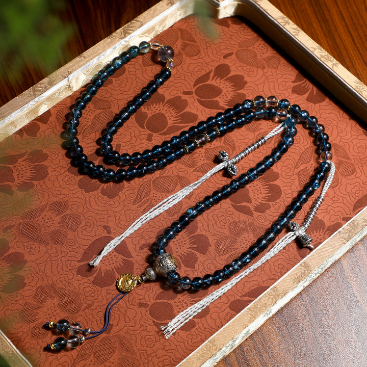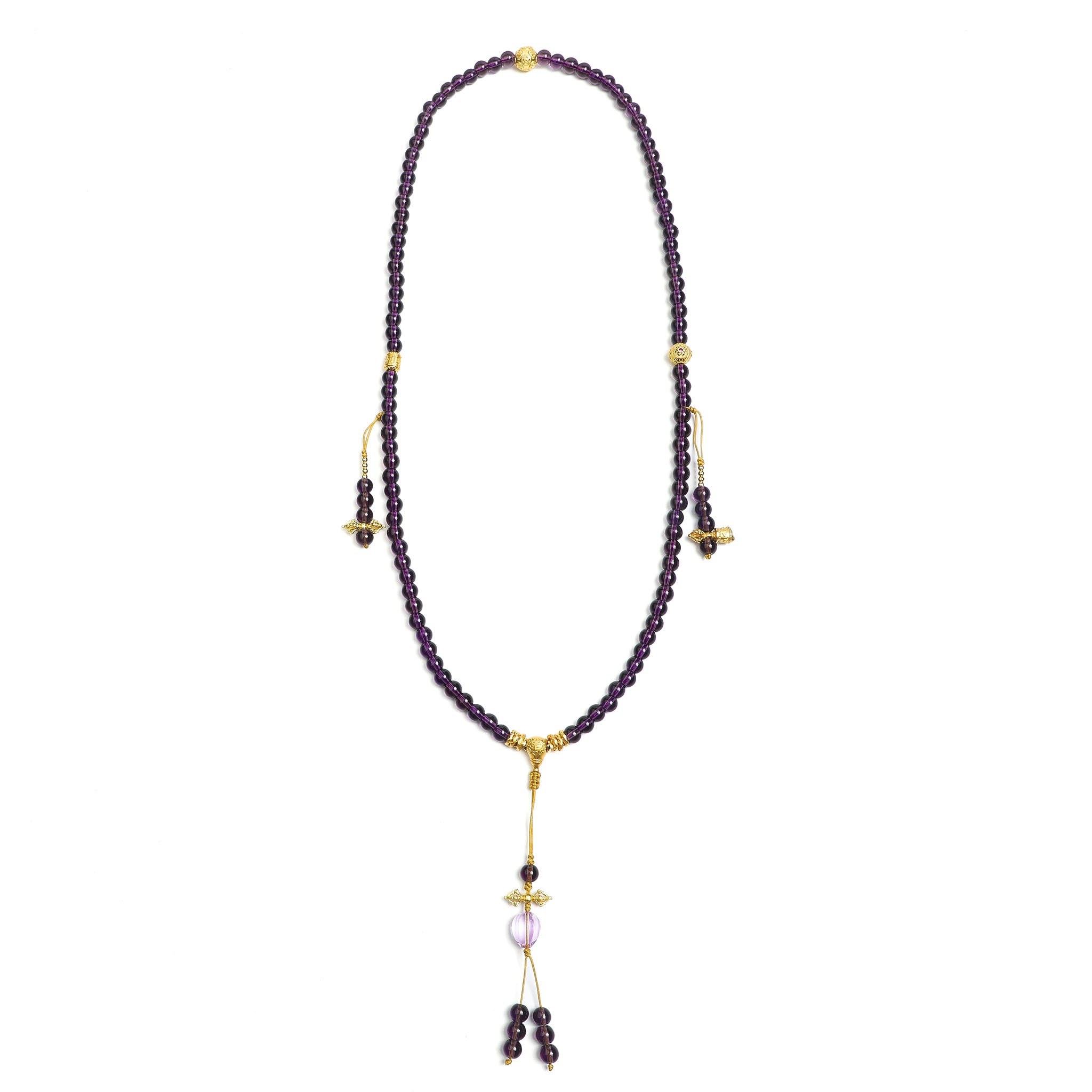This long necklace features natural amethyst beads gradated from light to deep purple, evoking the twilight sky. Each crystal retains natural fissures and cloud-like patterns, hand-polished to a soft luster. The versatile length can be worn singly for elegance or layered for richness.