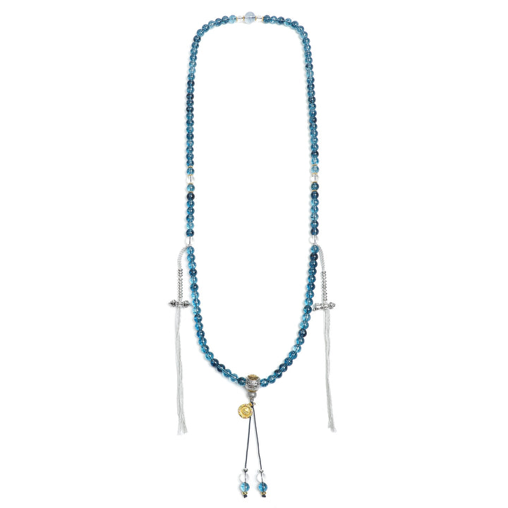 Aquamarine beads in clear oceanic tones range from light to deep blue in this long necklace. Each gemstone reveals unique liquid inclusions and light movements, hand-polished to maintain crystalline transparency. Eastern tradition connects aquamarine with courage and tranquility.