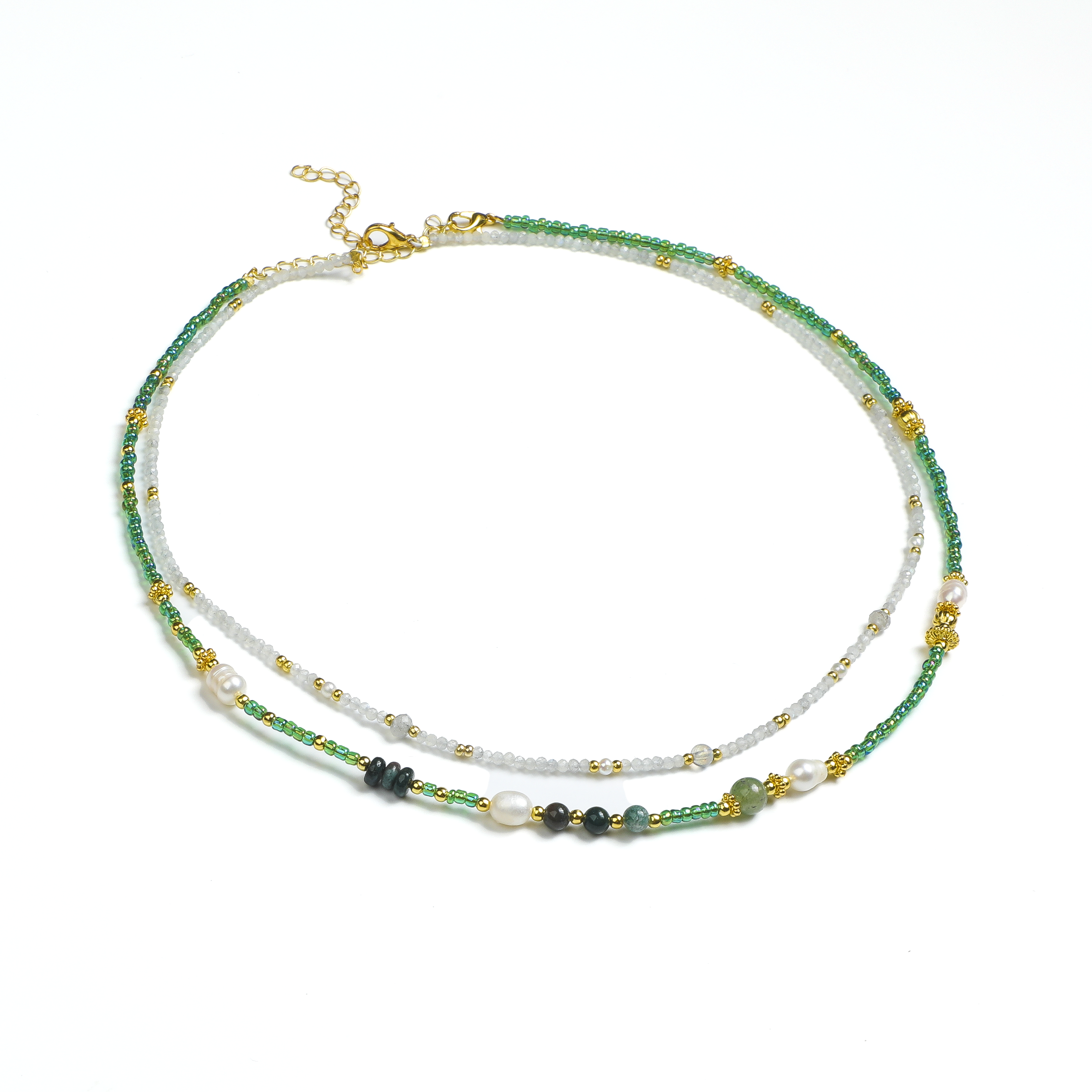 Zen Double-Layer Green Crystal and Pearl Necklace