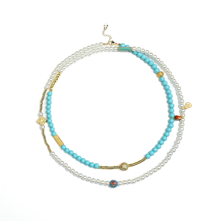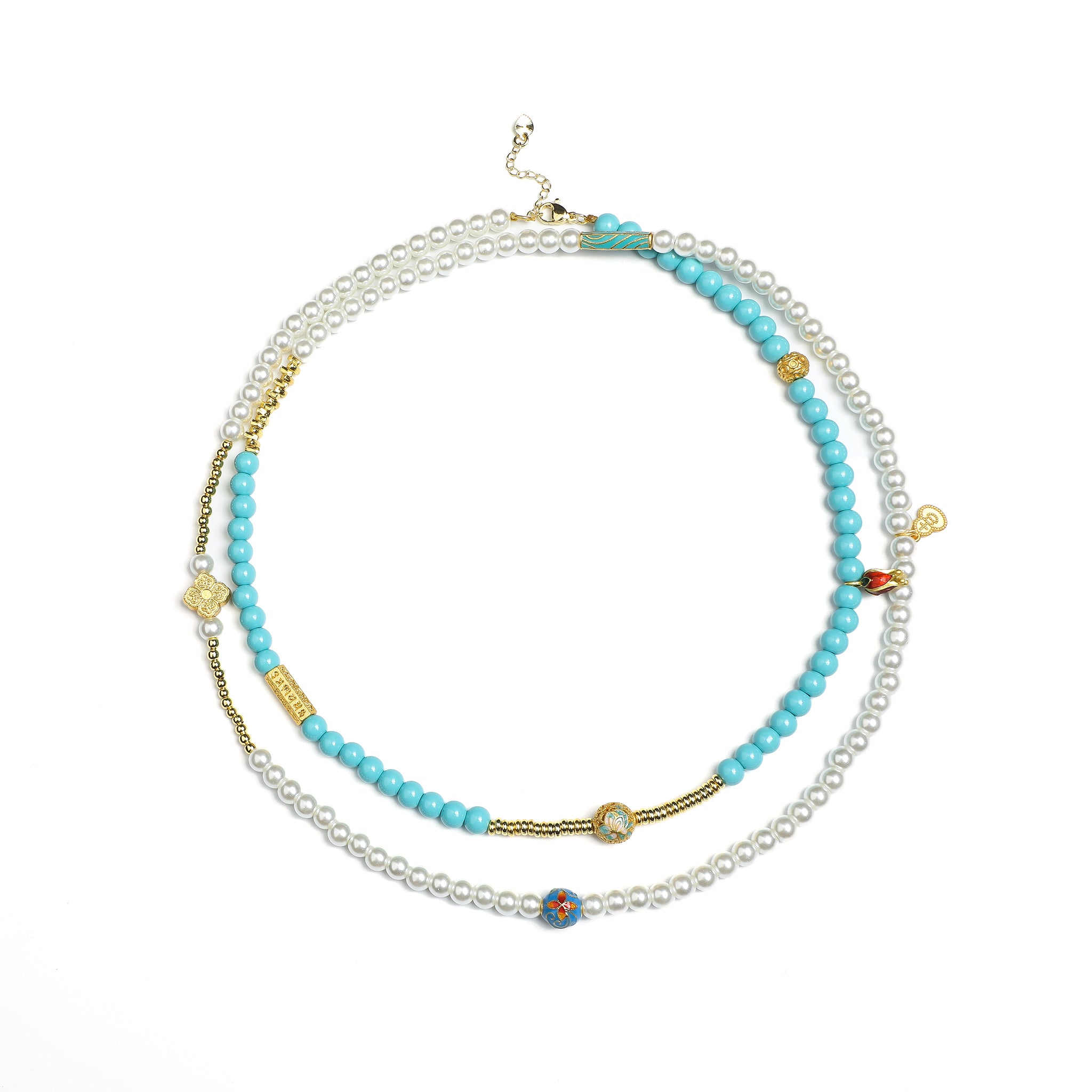 Natural turquoise and freshwater pearls intertwine in this double-layer design, accented with handcrafted enamel beads. Turquoise displays unique spiderweb patterns in sky-blue hues, pearls offer a soft glow, while enamel beads echo Eastern aesthetics in blue-and-white tones. Each layer is carefully balanced to be worn separately or together for versatile styling.