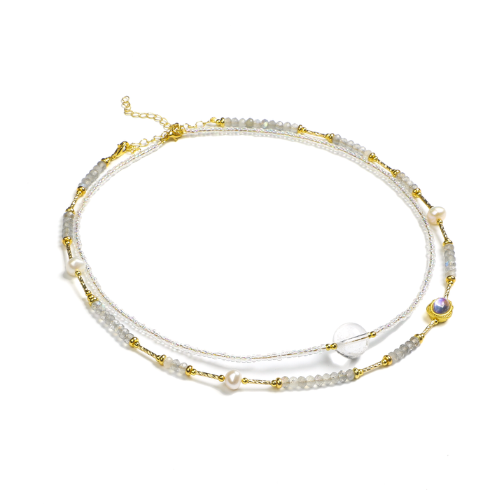 This Zen Collection piece presents a dual-strand design combining smoky quartz and amethyst crystals. The smoky quartz offers earthy translucency while the amethyst provides regal purple tones, creating a sophisticated color harmony. In Eastern traditions, smoky quartz is often connected to grounding energy and amethyst to spiritual awareness. The parallel strands create a graceful drape that moves with the wearer's posture. This piece transitions elegantly from daytime professional settings to evening occasions. As a distinctive design in our collection, it embodies the Zen principle of balancing earthly and spiritual elements.