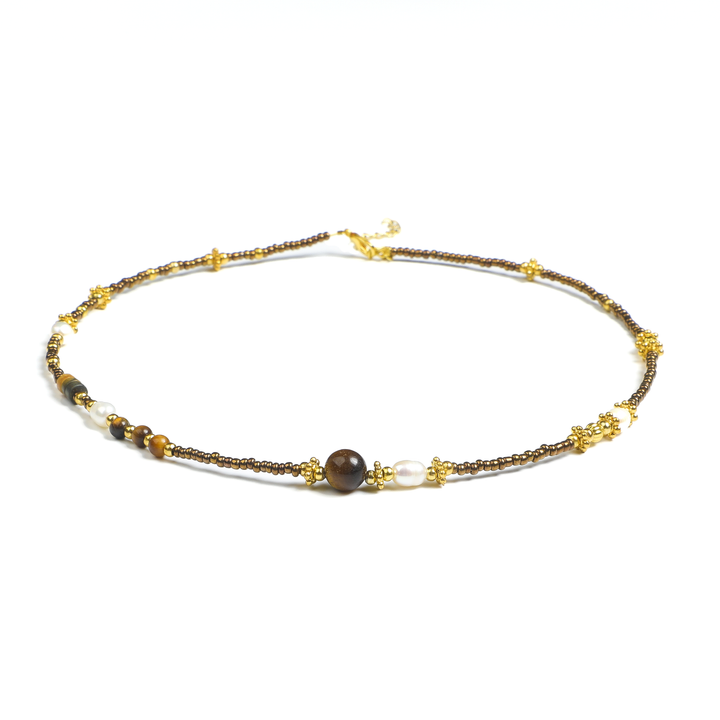 This Zen Collection piece unites the earthly warmth of tiger's eye with the luminous softness of cultured pearls. Each tiger's eye stone displays captivating chatoyancy, while the pearls offer a gentle contrast with their smooth surfaces. In Eastern traditions, tiger's eye is often associated with grounded confidence, and pearls with inner wisdom. The design creates a balanced composition that moves gracefully with the wearer. This versatile piece transitions seamlessly from daytime professional settings to evening occasions. As a unique selection in our collection, it embodies the Zen principle of harmonizing contrasting elements into a cohesive whole.