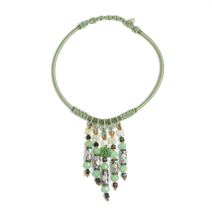 In Eastern tradition, jade symbolizes virtue and eternity, with glass representing purity and wisdom. This piece complements both daily wear and traditional celebrations, with every detail revealing unique handmade beauty. Each glass bead's hand-painted design varies, making the necklace an inheritable wearable art.